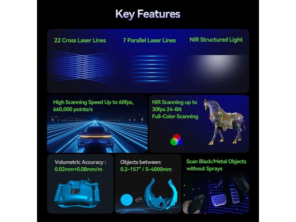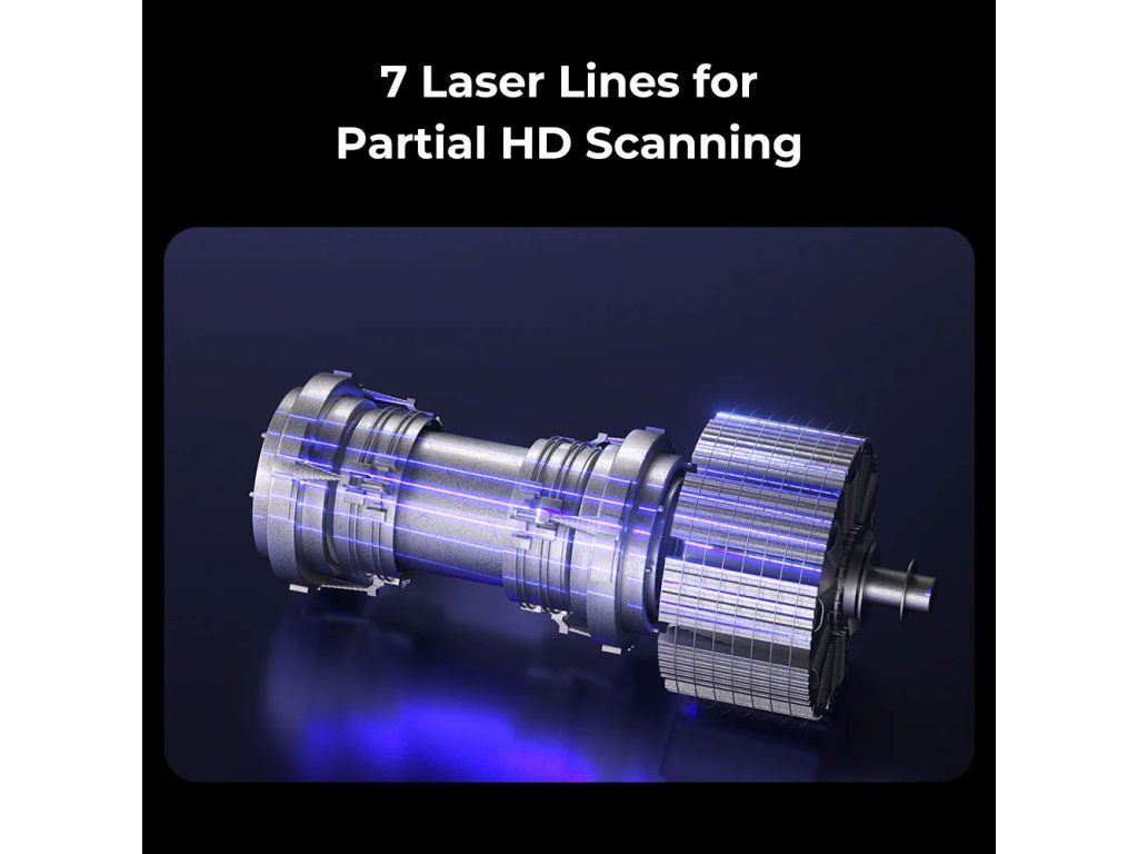 - ✅ Tři skenovací režimy v jednom přístroji – Paralelní laser (7 čar) pro detailní přesné skenování malých objektů od 5 × 5 × 5 mm, křížový laser (22 čar) pro rychlé skenování velkých ploch, infračervený režim pro skenování obličeje, těla nebo artefaktů bez markerů.