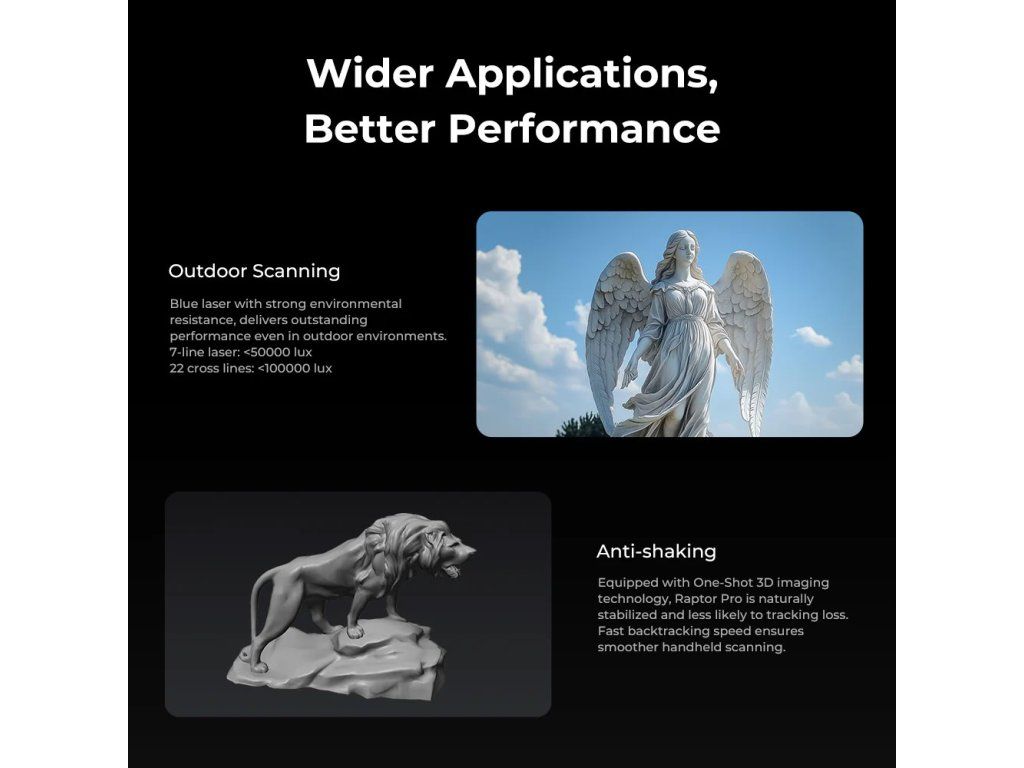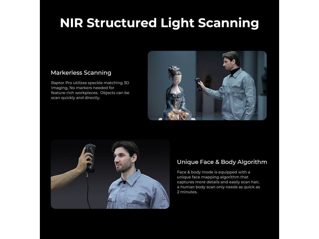 - ✅ Umění, muzea a digitalizace kulturního dědictví – Infračervený režim bez markerů umožňuje šetrné skenování soch, artefaktů a lidských figur pro archivaci, 3D tisk nebo virtuální výstavy.