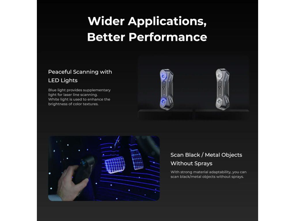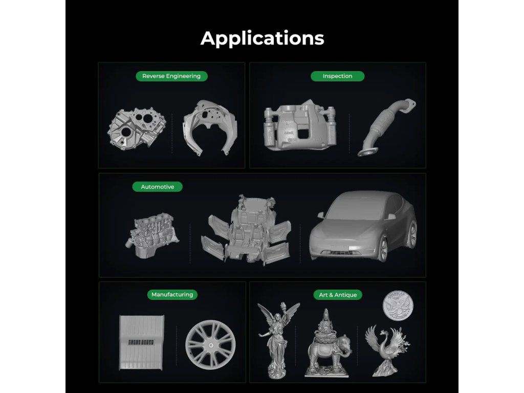 - ✅ Automotive a karosářské dílny – Kontrola rozměrů dílů, skenování karoserií pro custom úpravy a full-size inspekce vozidel bez nutnosti drahého stacionárního vybavení.