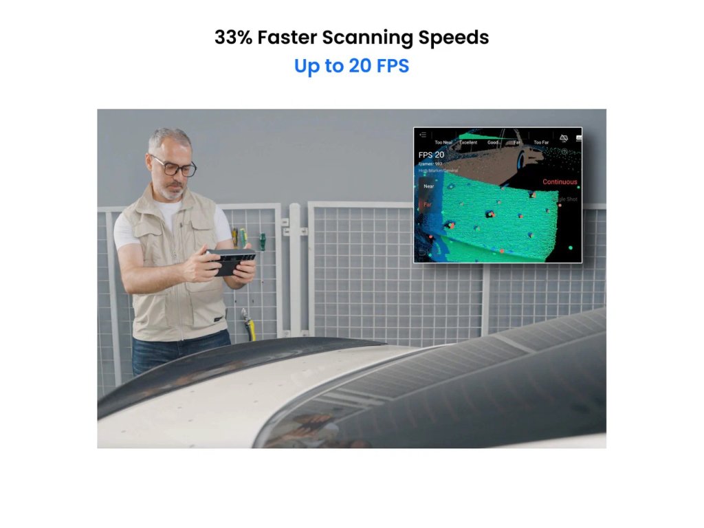 - ✅ Rychlost skenování až 20 FPS: Rychlejší sběr dat znamená méně času okolo objektu a svižnější iterace skenů.