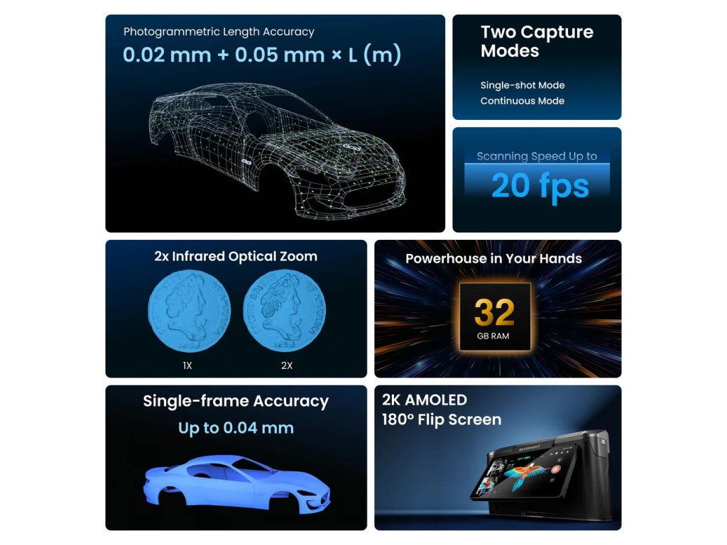 - ✅ Single-frame přesnost až 0,04 mm: Vhodné pro detailní digitalizaci dílů, tvarové kontroly a reverzní inženýrství.