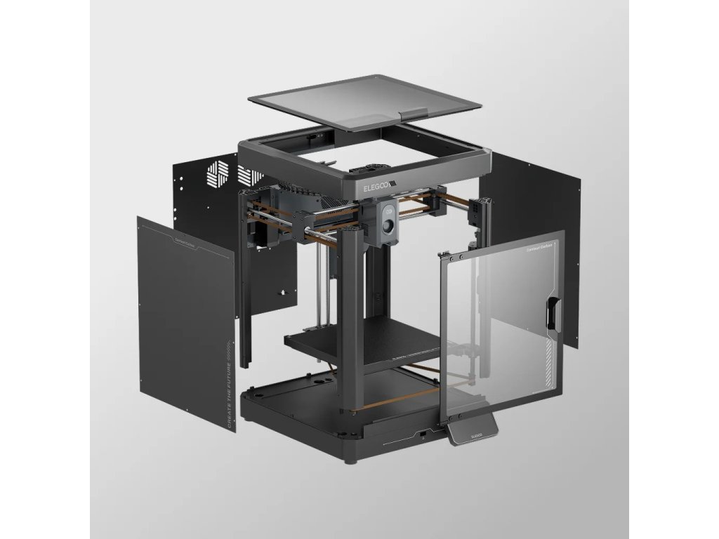 Elegoo Centauri Carbon je vysoce výkonná 3D tiskárna pro aditivní výrobu postavená na osvědčené CoreXY kinematice, která dosahuje rychlosti tisku až 500 mm/s s akcelerací až 20 000 mm/s². Tato tiskárna z plastu kombinuje robustní integrovanou konstrukci z litého hliníku s automatickou kompenzací vibrací, což zajišťuje extrémně přesné výtisky i při maximálních rychlostech bez efektů ghostingu nebo ringingu. Uzavřená konstrukce s průhlednými dvířky z tvrzeného skla a horním krytem vytváří stabilní tiskové prostředí pro technické materiály jako ABS, ASA, PA nebo kompozitní filamenty s uhlíkovými a skleněnými vlákny, zatímco integrovaný aktivní uhlíkový filtr efektivně odstraňuje nepříjemné zápachy a výpary.