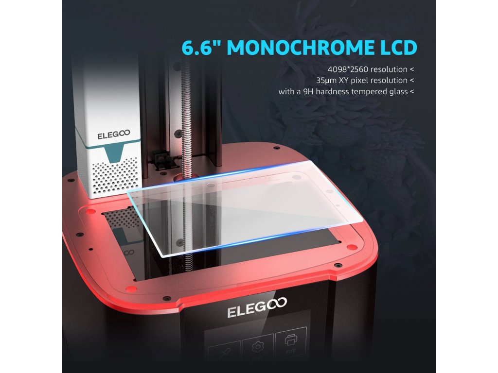 4K Monochrome LCD – 6,6 palcový 4K monochromatický LCD displej s vyměnitelným tvrzeným sklem proti poškrábání s tvrdostí 9H pro lepší propustnost světla při vysokém rozlišení 4098 x 2560, která chrání obrazovku a zároveň v největší míře obnovuje detaily modelu.
