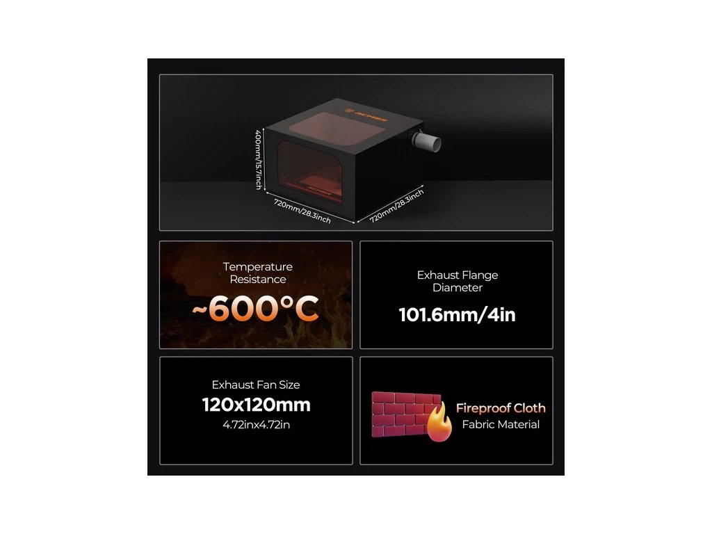 Klíčovou vlastností tohoto boxu je jeho bezpečnost. Je vyroben z dvouvrstvého ohnivzdorného materiálu, který vám dává jistotu i při delších a náročnějších projektech. Stabilní a pevná konstrukce se snadno skládá a díky velkorysým rozměrům je kompatibilní s většinou oblíbených laserových gravírek na trhu. Kromě ochrany před kouřem a ohněm box také skvěle izoluje hluk a zabraňuje usazování prachu na vašem stroji, čímž prodlužuje jeho životnost.