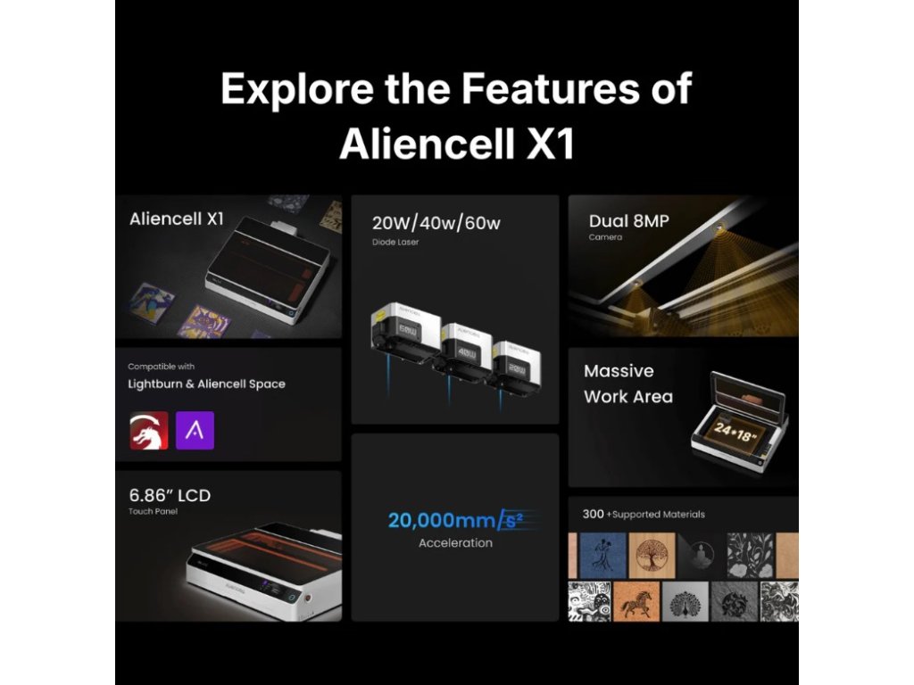 - ✅ Kompatibilita se softwarem Aliencell Space i LightBurn: X1 20W funguje s bezplatným softwarem Aliencell Space (Windows, macOS, Linux) speciálně navržený pro řadu X1 s podporou všech pokročilých funkcí včetně real-time renderingu, AI detekce materiálů a touchscreen ovládání [web:34]. Alternativně můžete používat profesionální software LightBurn pro pokročilé nástroje a kontrolu.