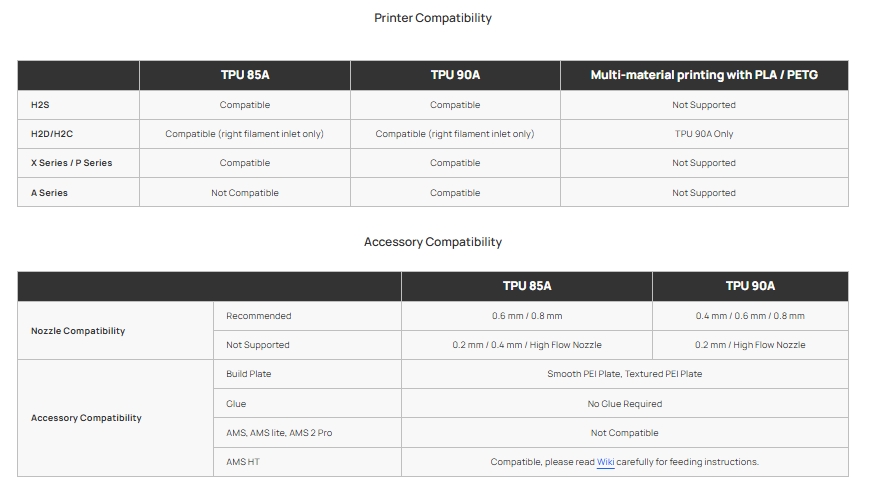 Oba filamenty tisknou bez nutnosti lepidla na hladké i texturované PEI podložce. TPU 90A je navíc kompatibilní se všemi tiskárnami Bambu Lab (H2S, H2D/H2C, X Series, P Series i A Series) a u tiskáren H2D/H2C ho lze kombinovat s PLA nebo PETG v rámci multi-material tisku. TPU 85A tiskne na H2S, H2D/H2C (pravý vstup filamentu) a na X/P Series.