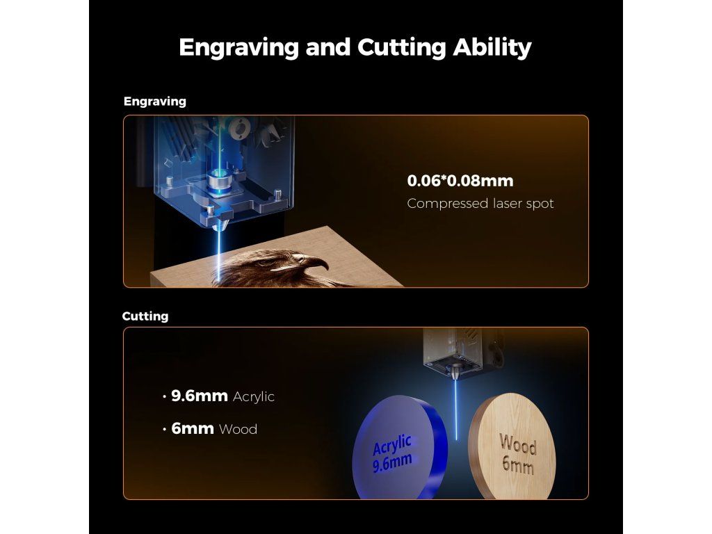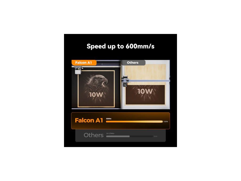 Srdcem Falcon A1 je duální laserový paprsek s ultra-jemnou stopou 0,06 × 0,08 mm, který zvládá přesné gravírování i čisté řezání. XY osa se dvěma motory dosahuje rychlosti až 600 mm/s s dobou rozjezdu pouhých 0,03 s. Řemeny se napínají automaticky, přesnost pohybu je garantována na 0,01 mm. To vše znamená jediné: ostré linie, čisté řezy a výsledky, které vypadají profesionálně i při prvním spuštění.