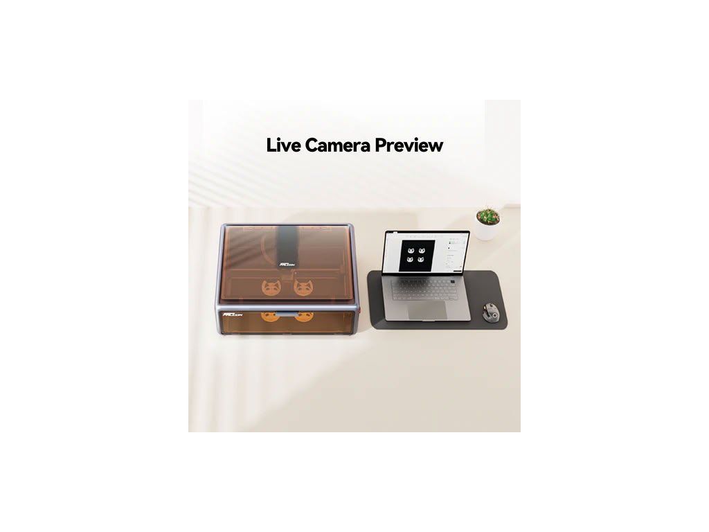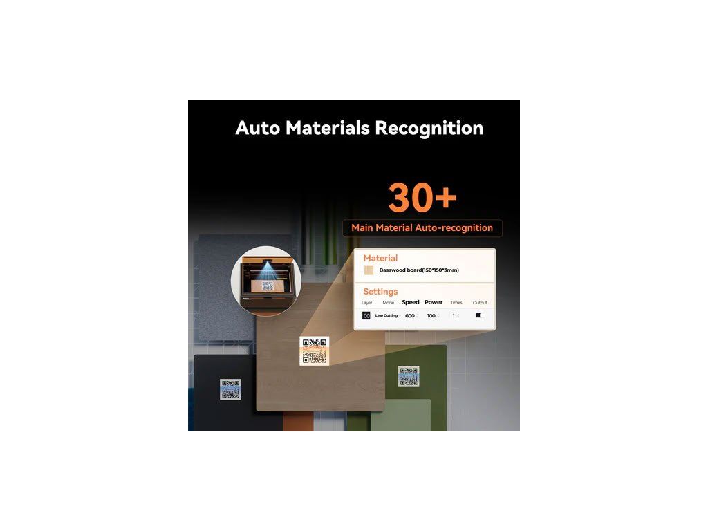 Integrovaná HD kamera umí automaticky rozpoznat polohu předmětu na pracovní ploše a připravit projekt přímo podle jeho umístění. Podporuje dávkové zpracování – stačí rozložit více předmětů a kamera je sama zaměří. Systém QR kód detekce materiálu pak automaticky navrhne správné parametry výkonu a rychlosti pro daný materiál. Výsledek: méně manuálního nastavování, méně zničených polotovarů.
