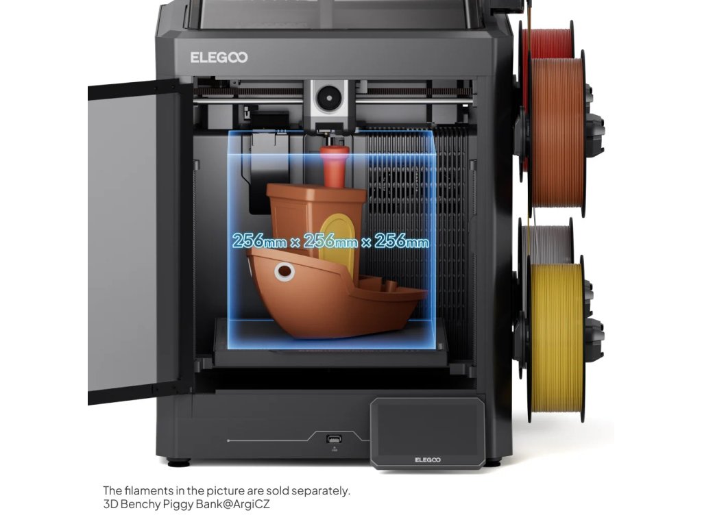 Odpověď: Tiskárna tiskne s filamenty 1,75 mm od jakéhokoli výrobce. Funkce automatického rozpoznání (RFID) je dostupná pouze pro cívky Elegoo s RFID čipem, které aktivují doporučená nastavení tisku automaticky. U filamentů jiných značek nastavíte parametry ručně přes dotykový displej nebo v ElegooSliceru — tiskárna bez problémů poradí i s filamenty třetích stran.