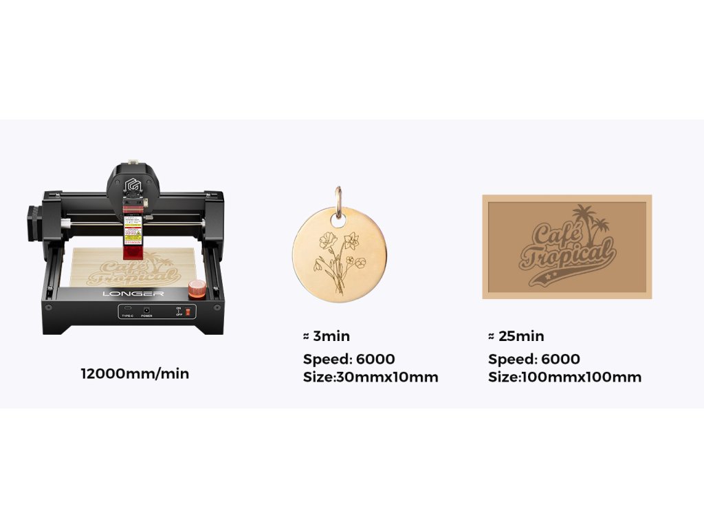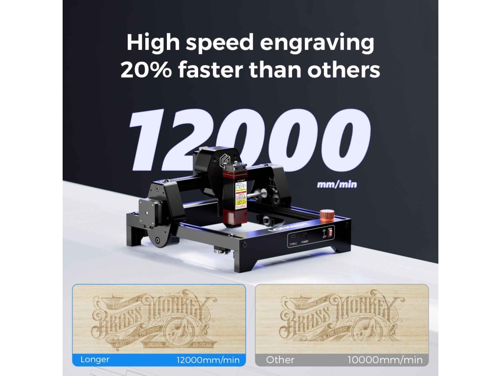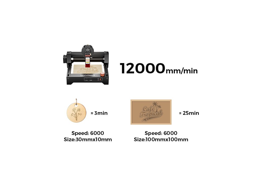 - ✅ Extrémní rychlost gravírování až 12 000 mm/min: Všechny tři varianty Ray5 mini dosahují rychlosti gravírování až 12 000 mm/min (200 mm/s), což výrazně zkracuje dobu projektu. To je rychlejší než většina konkurenčních mini gravírovaček v této cenové kategorii. Rychlost můžete nastavit v rozsahu dle materiálu a požadované kvality gravírování. Vysoká rychlost znamená, že dokončíte projekty rychleji a můžete se věnovat více kreativní práci.