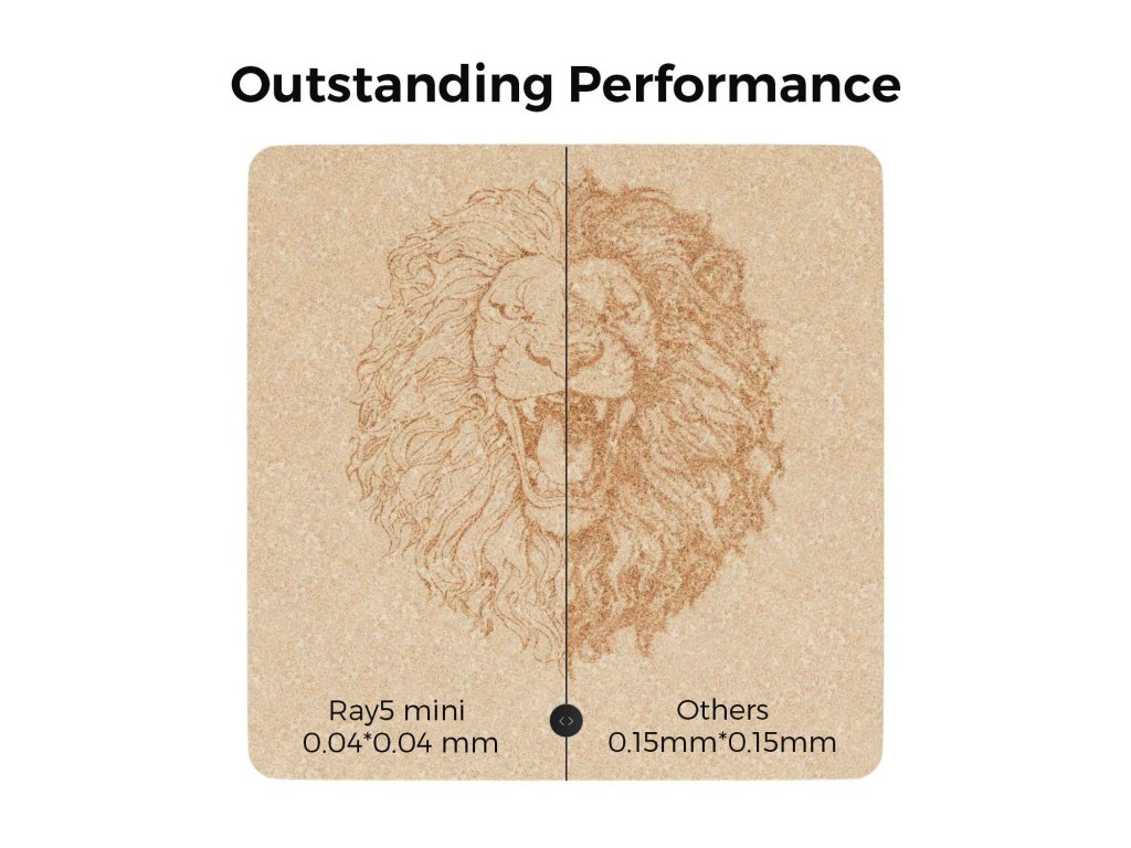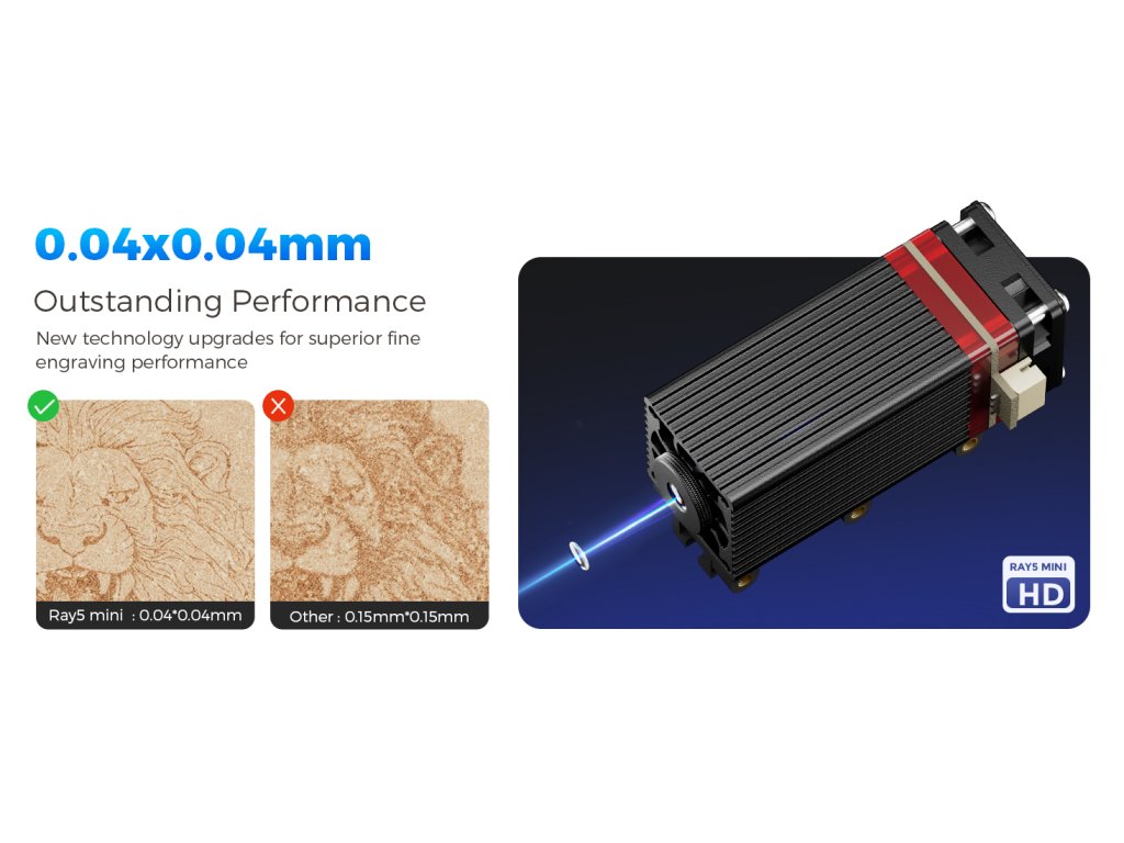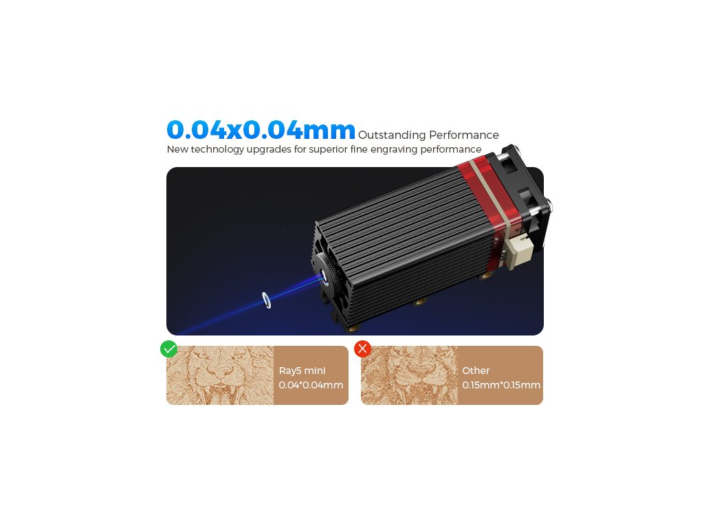 - ✅ Profesionální přesnost 0,04 mm: Ray5 mini nabízí přesnost gravírování až 0,04 mm, což zaručuje ostrost linek, detailní písmo a precizní reprodukci designu. Technologie FAC (Fast Axis Collimation) komprimuje laserový bod na ultra-jemnou velikost 0,04 × 0,04 mm, což zajišťuje maximální koncentraci energie a ostrost gravírování. Díky tomu můžete vytvářet jemné linie, malá písmena a složité vzory s výjimečnou přesností.