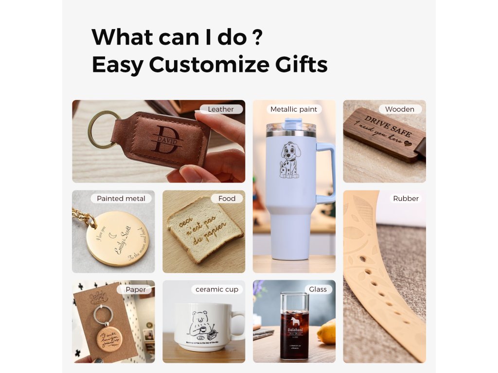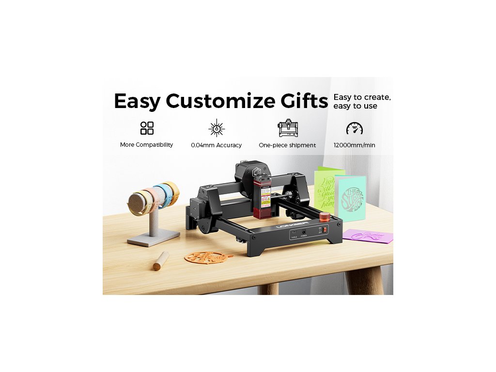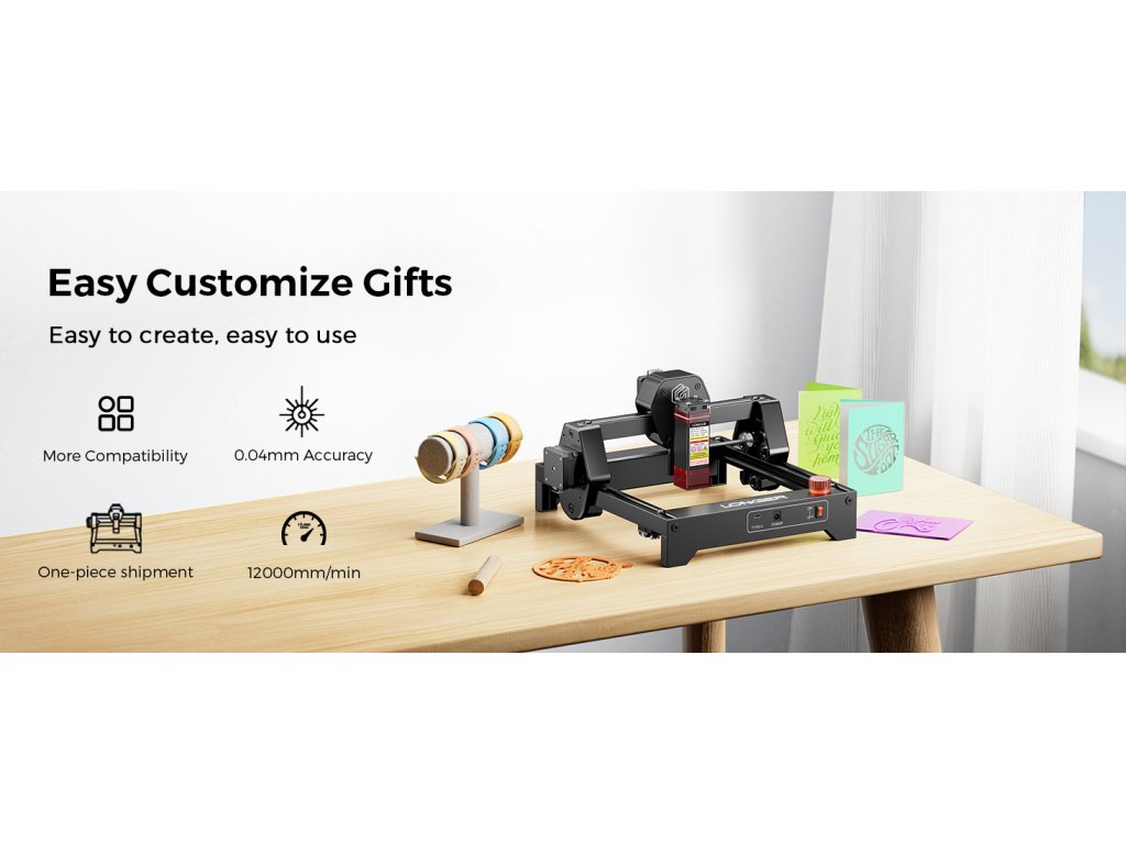 - ✅ Personalizace dárků a malá výroba: Ray5 mini je ideální nástroj pro personalizaci dárků (gravírování jmen, dat, věnování na dřevěné krabičky, fotorámečky, šperky, mobily) nebo malou zakázkovou výrobu (visačky, jmenovky, dekorace). Kompaktní rozměry a rychlost až 12 000 mm/min umožňují rychlou sériovou výrobu. Mobilní aplikace LaserBurn vám umožní gravírovat přímo z telefonu, což je ideální pro rychlé zakázky na místě.