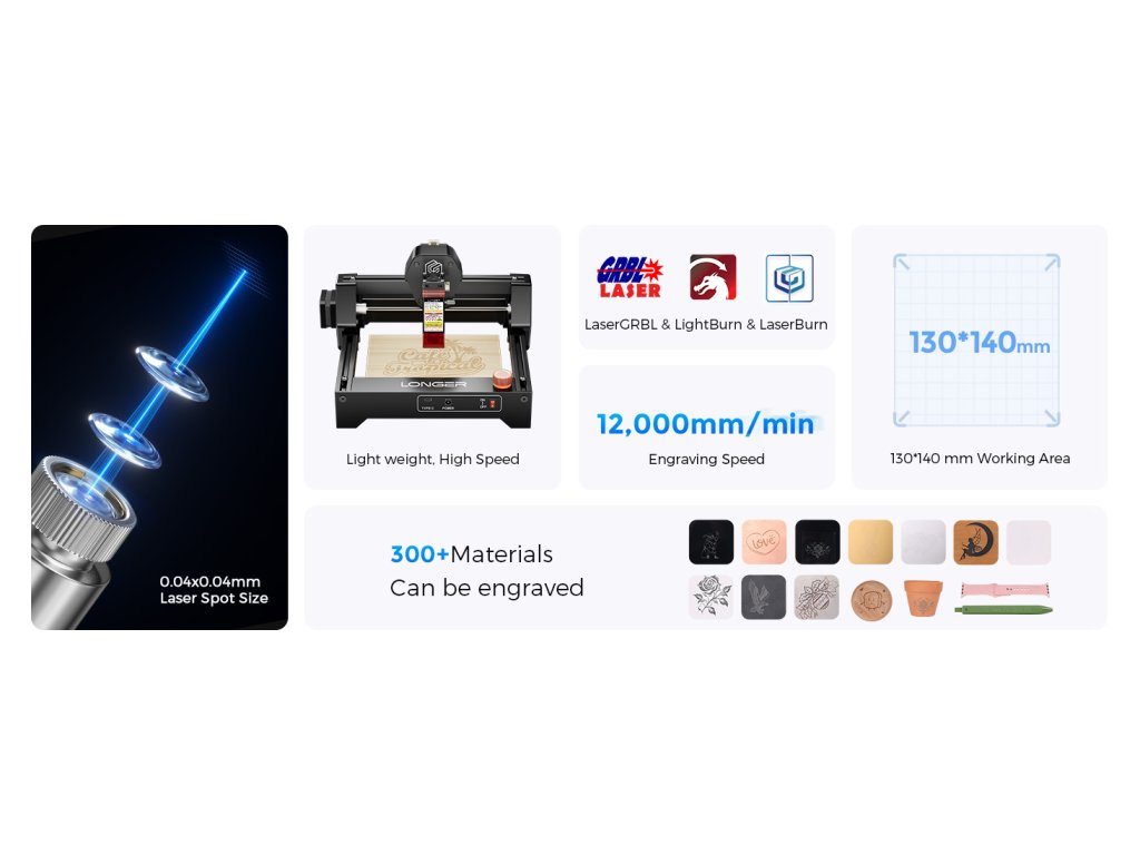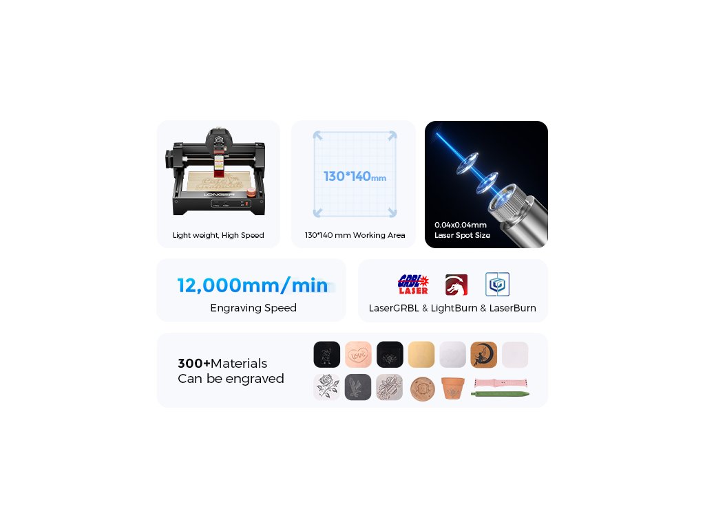 | Kompatibilní software | LightBurn (Windows, macOS, Linux), LaserGRBL (Windows), LaserBurn App (Android, iOS) | ||