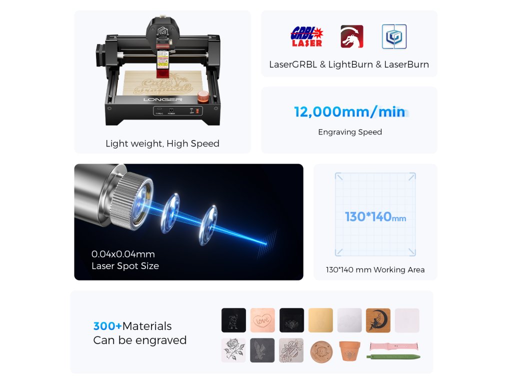 Longer Ray5 mini je kompaktní laserová gravírovačka a řezačka navržená speciálně pro začátečníky, hobby uživatele, studenty a kreativce, kteří hledají kombinaci dostupné ceny, snadného ovládání a kompaktních rozměrů. Tato mini laserová gravírovačka nabízí pracovní plochu 130×140 mm, což ji činí ideálním nástrojem pro gravírování a řezání menších projektů, personalizaci dárků, tvorbu šperků, gravírování dřevěných popisků nebo výrobu miniaturních dekorací. Ray5 mini gravíruje a řeže všechny běžné materiály jako dřevo, kůži, papír, textil, akryl, eloxovaný hliník nebo kovové povrchy s nátěrem.