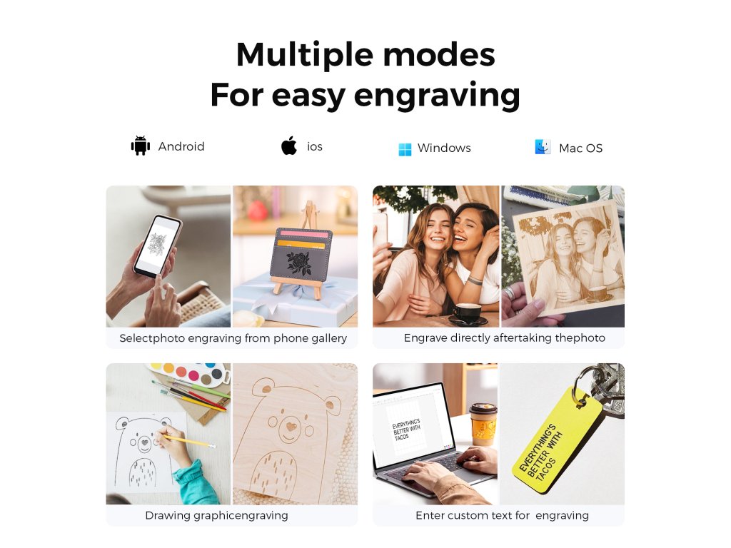 - ✅ Kreativci a designéři: Umělci, designéři a tvůrci ocení kompaktní rozměry pro menší projekty, vysokou přesnost 0,04 mm pro detailní gravírování a mobilní ovládání. Ideální pro tvorbu uměleckých děl, prototypování, personalizaci designových předmětů nebo výrobu šperků. WiFi připojení a mobilní aplikace LaserBurn vám umožní pracovat flexibilně bez nutnosti mít počítač na pracovním stole.