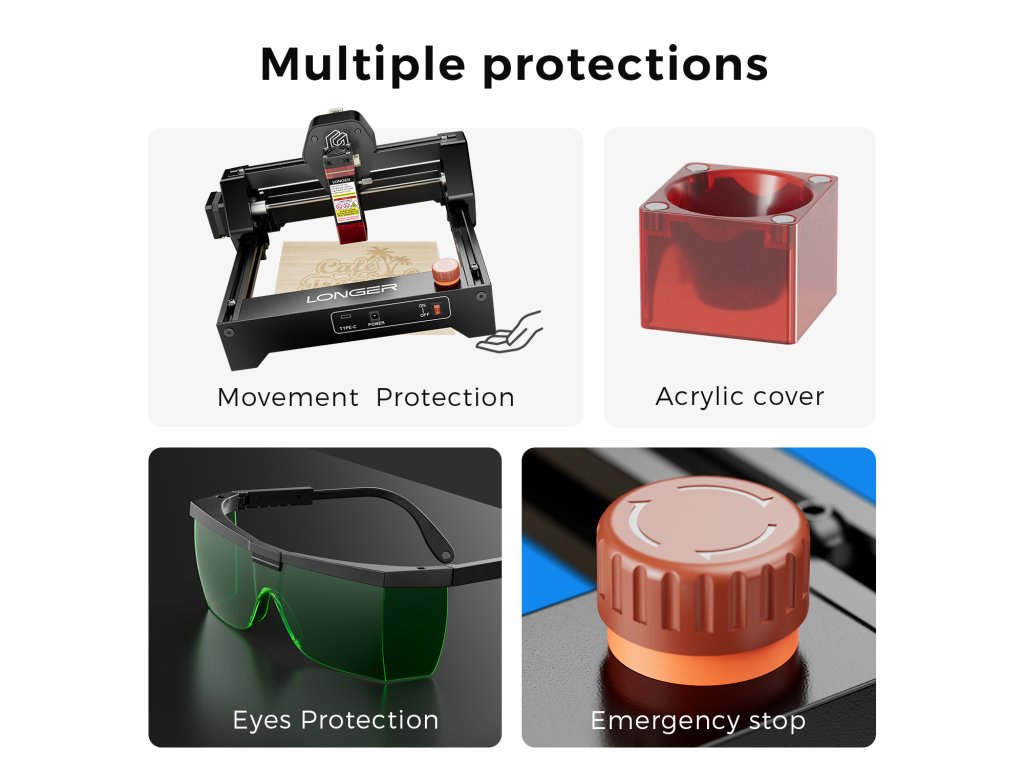 - ✅ Nouzové zastavení a ochrana pohybu: Ray5 mini je vybavena tlačítkem nouzového zastavení (Emergency Stop), které okamžitě zastaví laser v případě nebezpečí. Systém ochrany pohybu (Movement Protection) automaticky detekuje neočekávané posuny nebo vibrace během gravírování a pozastaví práci, aby se zabránilo poškození materiálu nebo stroje. Tyto bezpečnostní funkce činí Ray5 mini jednou z nejbezpečnějších mini gravírovaček na trhu.