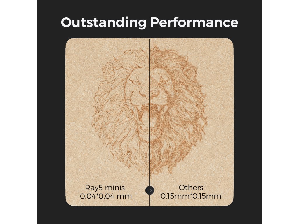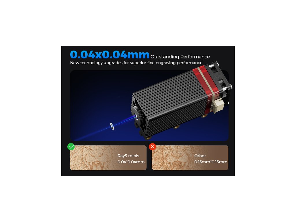 • Profesionální přesnost 0,04 mm: Ray5 miniS nabízí přesnost gravírování až 0,04 mm, což zaručuje ostrost linek, detailní písmo a precizní reprodukci designů. Technologie FAC (Fast Axis Collimation) komprimuje laserový bod na ultra-jemnou velikost 0,04 × 0,04 mm, což zajišťuje maximální koncentraci energie a ostrost gravírování. Díky tomu můžete vytvářet jemné linie, malá písmena a složité vzory s výjimečnou přesností.
