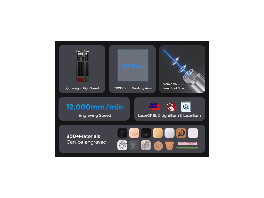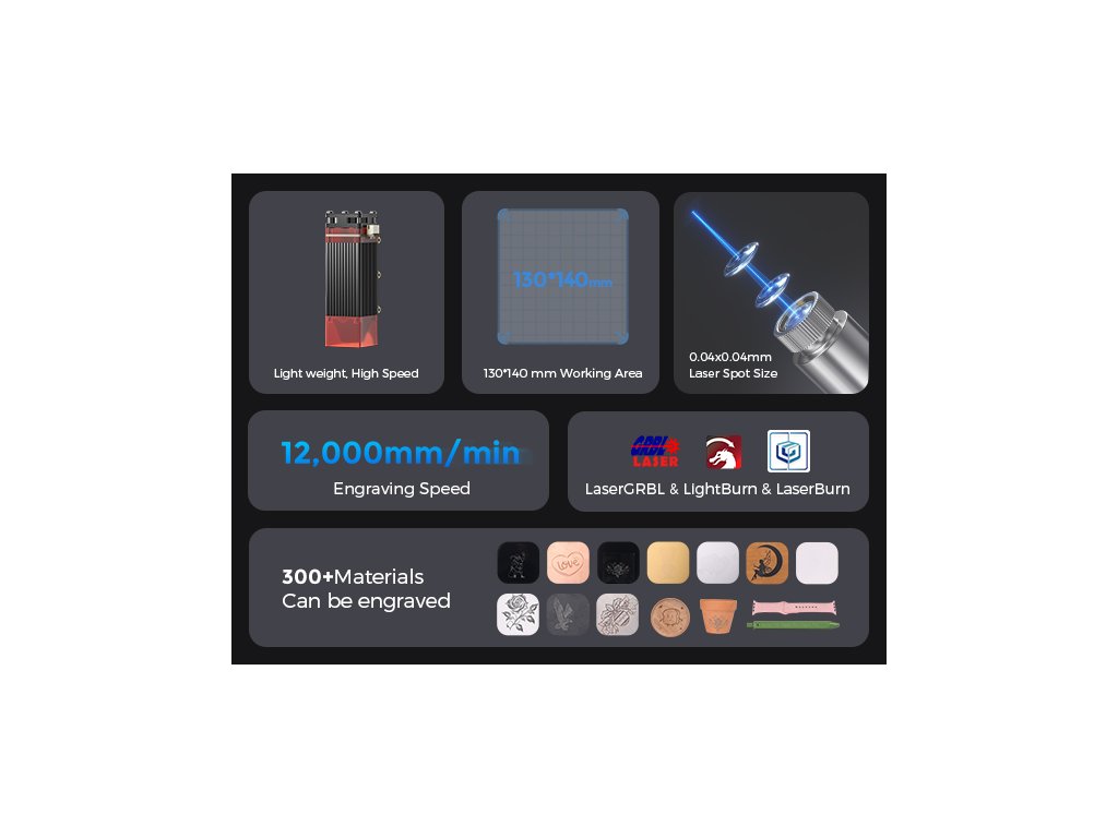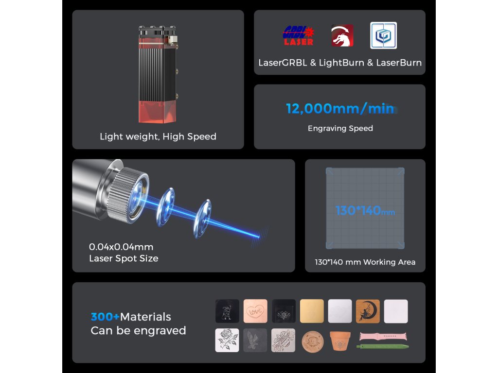 Kompatibilní software LightBurn (Windows, macOS, Linux), LaserGRBL (Windows), LaserBurn App (Android, iOS)
