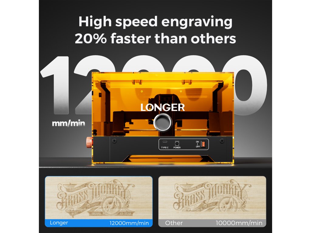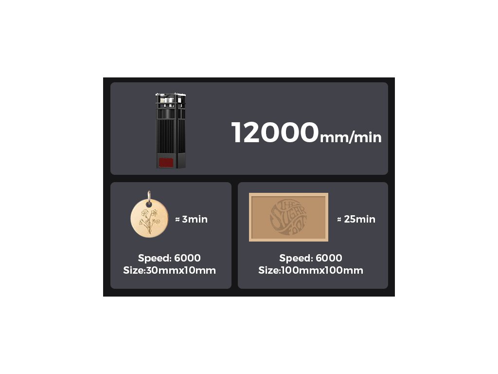 • Extrémní rychlost gravírování až 12 000 mm/min: Všechny tři varianty Ray5 miniS dosahují rychlosti gravírování až 12 000 mm/min (200 mm/s), což výrazně zkracuje dobu projektů. To je rychlejší než většina konkurenčních mini gravírovaček v této cenové kategorii. Rychlost můžete nastavit v rozsahu dle materiálu a požadované kvality gravírování. Vysoká rychlost znamená, že dokončíte projekty rychleji a můžete se věnovat více kreativní práci.