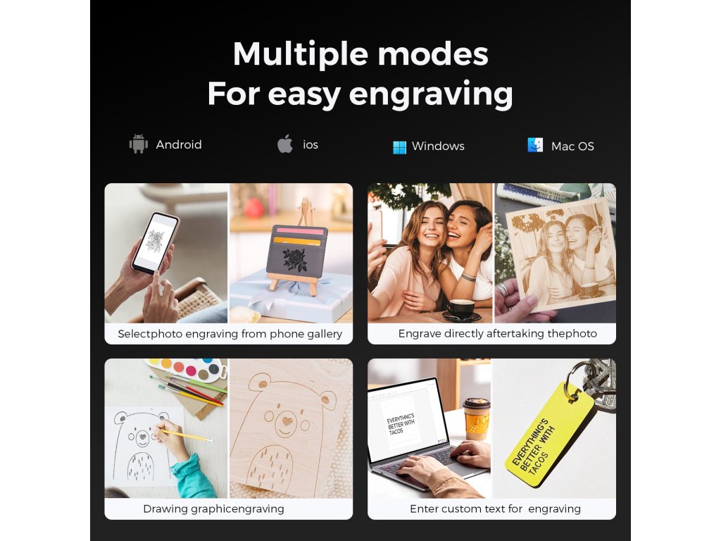 Odpověď: Ano. Ray5 miniS podporuje gravírování fotografií ve formátech JPG, PNG, BMP a dalších. Pro nejlepší výsledky doporučujeme použít kvalitní fotografie s vysokým kontrastem a převést je na černobílé. Software LightBurn nabízí pokročilé nástroje pro úpravu fotografií (Image mode: Atkinson, Stucki, Jarvis). Mobilní aplikace LaserBurn také podporuje import fotografií z telefonu.