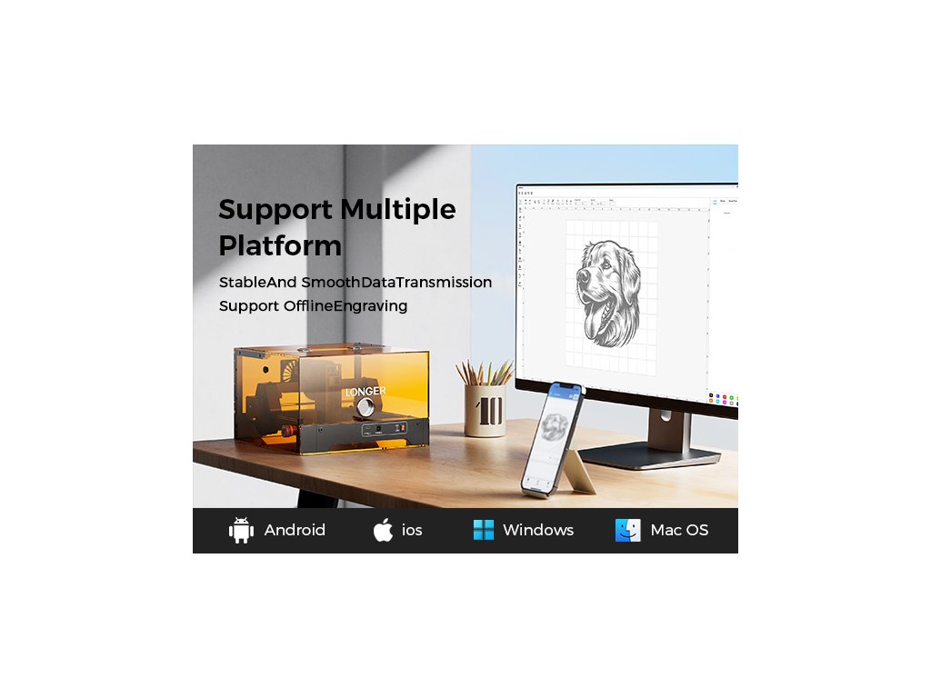 • WiFi připojení a mobilní aplikace LaserBurn: Ray5 miniS podporuje WiFi připojení a můžete ji ovládat přímo z mobilní aplikace LaserBurn (Android, iOS). Aplikace umožňuje nejen ovládat Ray5 miniS, ale také vytvářet a upravovat návrhy přímo na smartphonu nebo tabletu. Můžete importovat fotografie, generovat QR kódy, upravovat obrázky, nastavovat parametry gravírování (výkon, rychlost, počet průchodů) a spouštět projekty bezdrátově. Ideální pro uživatele, kteří preferují mobilní workflow a chtějí gravírovat odkudkoli bez nutnosti mít počítač.