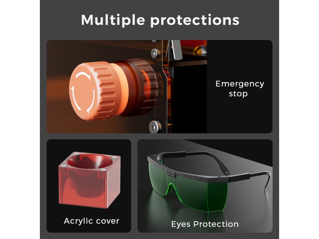 • Nouzové zastavení a ochrana pohybu: Ray5 miniS je vybavena tlačítkem nouzového zastavení (Emergency Stop), které okamžitě zastaví laser v případě nebezpečí. Systém ochrany pohybu (Movement Protection) automaticky detekuje neočekávané posuny nebo vibrace během gravírování a pozastaví práci, aby se zabránilo poškození materiálu nebo stroje. Tyto bezpečnostní funkce činí Ray5 miniS jednou z nejbezpečnějších mini gravírovaček na trhu.