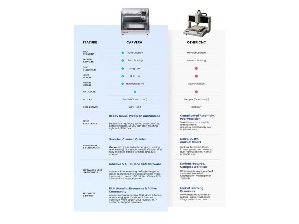 - Kompaktní design a tichý chod: Díky plně uzavřené konstrukci se Carvera Air vejde na každý pracovní stůl a její tichý provoz vás nebude rušit při práci. Je ideálním společníkem do menších dílen, kanceláří i vzdělávacích institucí.
