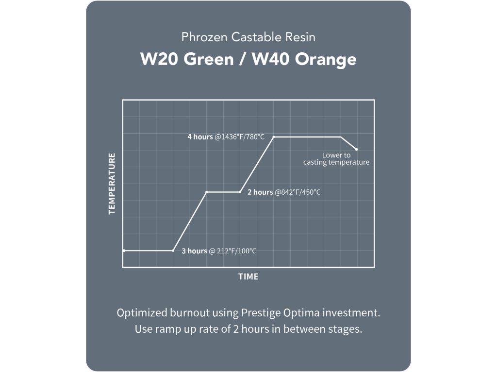 Phrozen Castable Resin W40 Orange je vyvinut pro spolehlivé lití s čistým vyhořením a nulovým obsahem popela. Je určen jak pro šperky, tak pro dentální odlévání, konkrétně pro velké organické kusy, jako jsou pečetní prsteny, školní prsteny nebo náramky, které mají širokou škálu designových prvků, jako jsou rytiny a vyvýšené detaily.