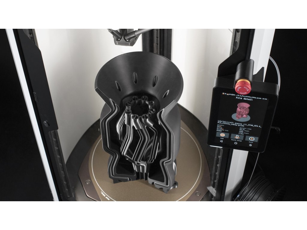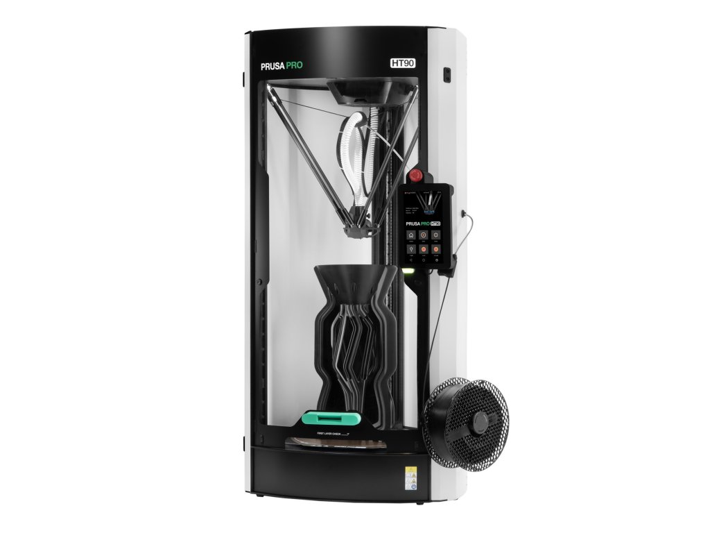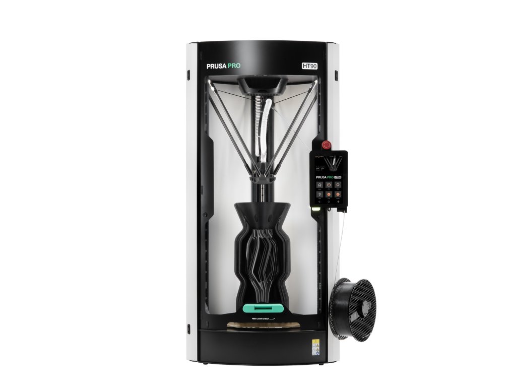 Prusa Pro HT90 je průmyslová 3D tiskárna s delta kinematikou a cylindrickým tiskovým objemem Ø300 × 400 mm, speciálně navržená pro aditivní výrobu s pokročilými materiály jako ABS, ASA, PCCF, PA, PEEK, PEKK, PPS, PSU, PES a PEI (Ultem). Díky aktivně vyhřívané komoře dosahující až 90 °C a inovativnímu servoklápkovému chladicímu systému poskytuje bezkonkurenční přilnavost vrstev a kvalitu tisku při prototypování i sériové výrobě. HT90 je cenově nejdostupnější 3D tiskárna schopná pracovat s vysokoteplotními filamenty až do 500 °C, což z ní činí ideální volbu pro letecký, automobilový, lékařský a chemický průmysl.
