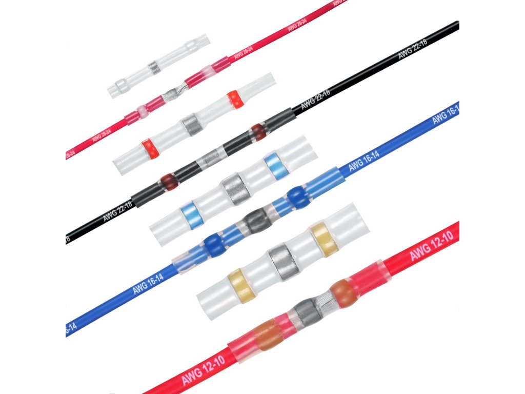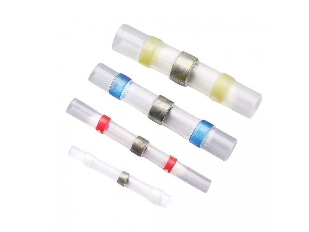 Smršťovací pájecí kabelové spojky s cínem pro snadné a rychlé spojení dvou vodičů, při zatavení pomocí horkovzdušné pistole či plynového hořáku dochází zároveň k zaletování vodičů pomocí kroužku cínu uvnitř spojky, spojka obsahuje lepidlo, které zajistí vodotěsnost.