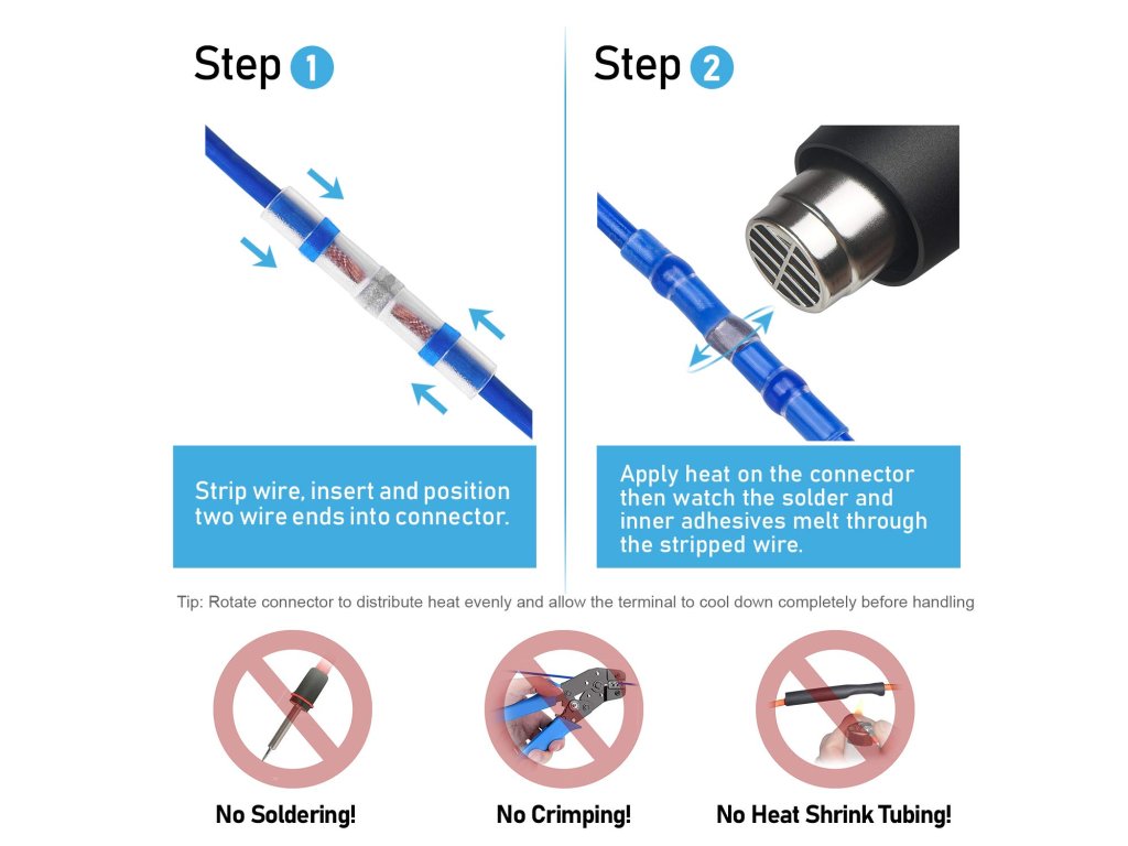 Balení obsahuje 50 kusů kabelových spojek s cínem a smršťovačkou s termoplastickým lepidlem. Tyto spojky jsou určeny pro bezpájené spojování kabelů, dvojlinek a jiných spojů/vodičů. Pro zafixování celého spoje stačí použít horkovzdušnou pistoli nebo plynový hořák.