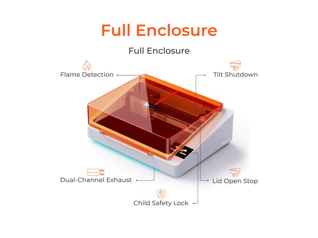 - Bezpečnost na prvním místě: Plně uzavřená konstrukce s certifikací třídy 1, detektorem plamene, gyroskopem pro detekci náklonu a automatickým vypnutím při otevření krytu. Můžete tak bezpečně tvořit doma, ve škole i v dílně. Vaše bezpečí je pro nás prioritou.